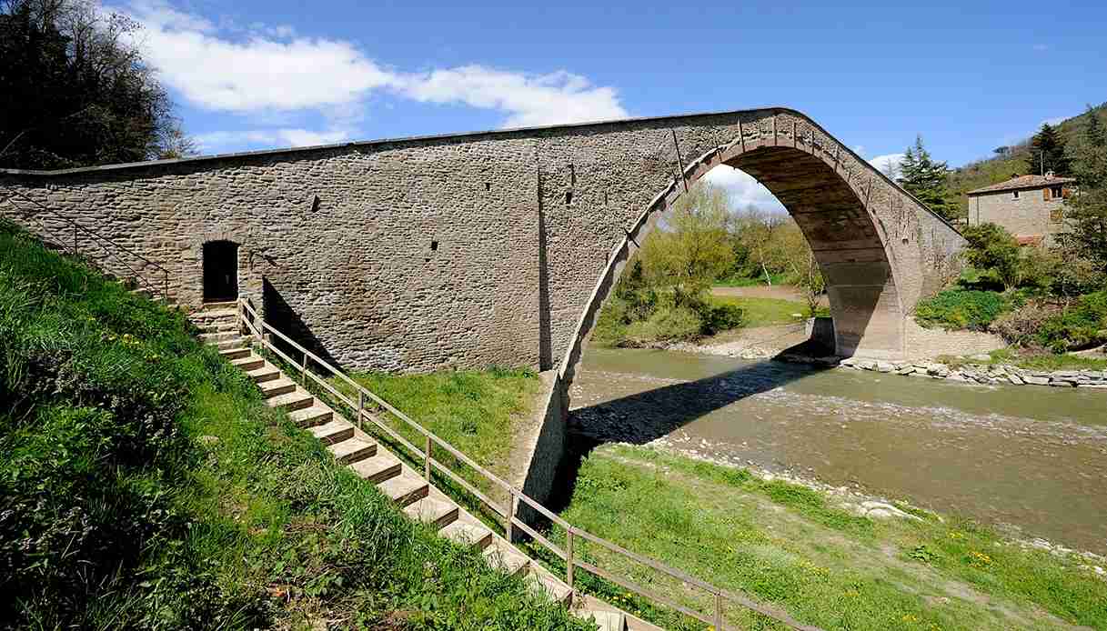 Sorge proprio sul corso del Santerno ed è probabilmente il più noto punto di attraversamento del fiume. Gli Alidosi, che avevano perso la signoria di Imola, lo fecero costruire nel 1499 per dar prova della loro persistenze potenza e presa su Castel del Rio, a cui il ponte fruttò discreti vantaggi economici. Oggi il ponte domina una zona ben tenuta sulle rive del fiume, una vera e propria spiaggia urbana dove potersi rilassare in estate, rinfrescarsi all’ombra delle acacie e fare un tuffo nella piscina naturale che si è creata ai piedi di uno strano masso a forma di fungo. Questo tratto del Santerno viene anche utilizzato per allenamenti di kayak.