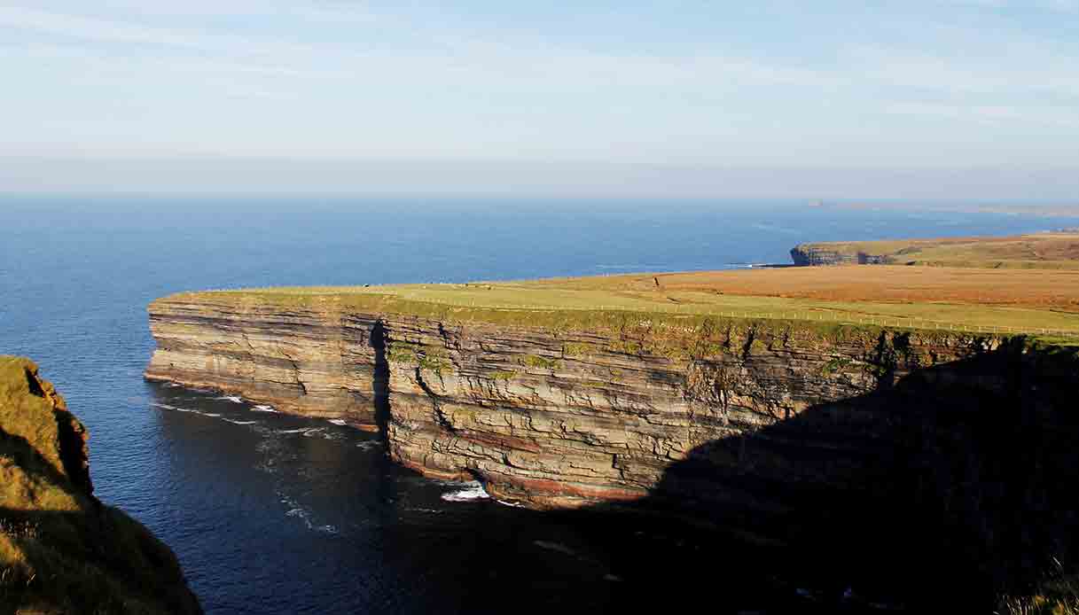 Le scogliere sono già visibili quando si visita Céide Fields, dove una terrazza accessibile tramite una scalinata chiamata Cliffs Road regala un panorama mozzafiato.