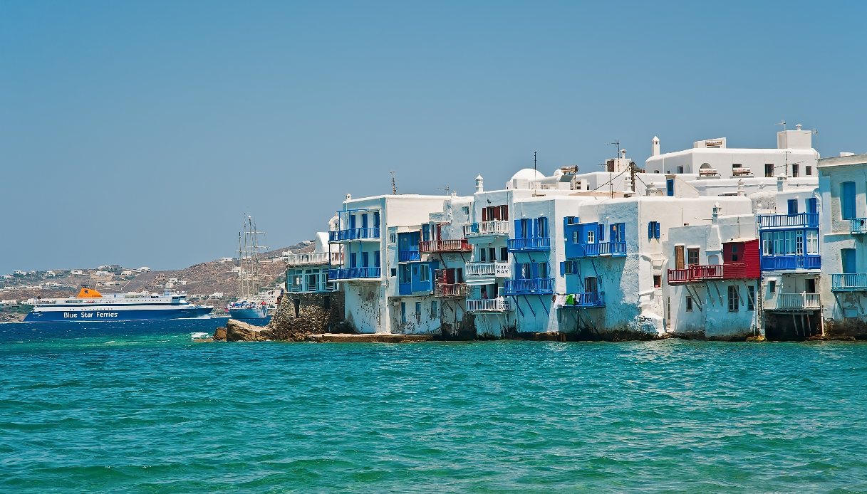 Le case, con i loro balconi colorati e le gallerie in legno, sono talmente vicine all’acqua da conferire al quartiere un’aria veneziana che ne ha ispirato il soprannome. Da qui si possono ammirare anche gli iconici mulini a vento, simbolo dell’isola, che si ergono maestosi con vista sul Mar Egeo.