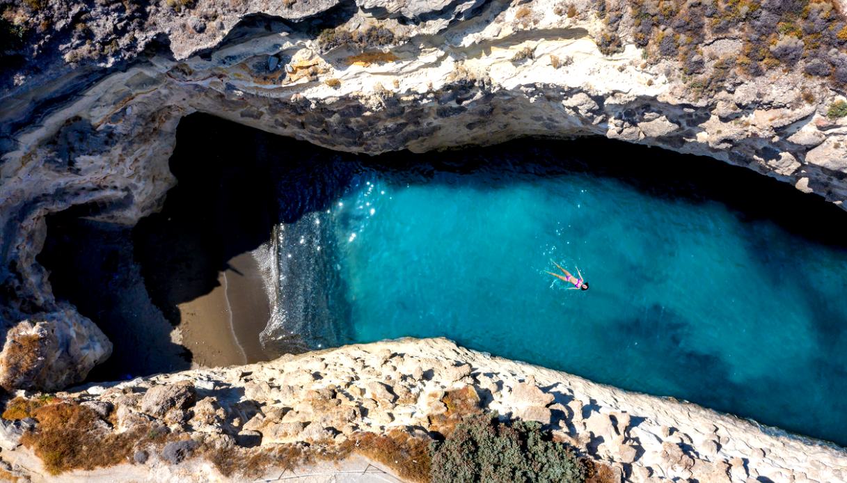 Priva di ombra e alberi, è un susseguirsi di rocce che sembrano modellate a mano, tutte lambite da acqua turchese che taglia l’orizzonte e con un costante profumo di sale sospeso nell’aria. È facilmente raggiungibile in auto o scooter da Plaka o Adamas, e l’accesso è libero, ma vista la sua purezza non ci sono servizi. Un piccolo segreto: scendendo dalle rocce verso le calette laterali si può vedere una grotta nascosta, con acqua verde smeraldo e temperatura perfetta anche in piena estate.