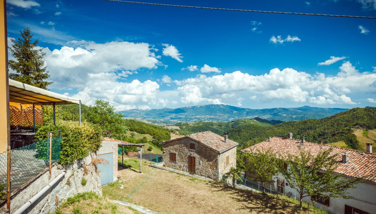 Attorno, il paese conserva un’anima autentica: antiche case contadine, piccole piazze che conservano la memoria dei giorni passati, e un orizzonte che toglie il fiato. Da qui lo sguardo spazia senza ostacoli: si scorgono il Monte Fumaiolo, l’Alpe della Luna, il Carpegna, fino ai bastioni di San Leo, alle torri di San Marino e, quando l’aria è tersa, persino al riflesso lontano del mare.