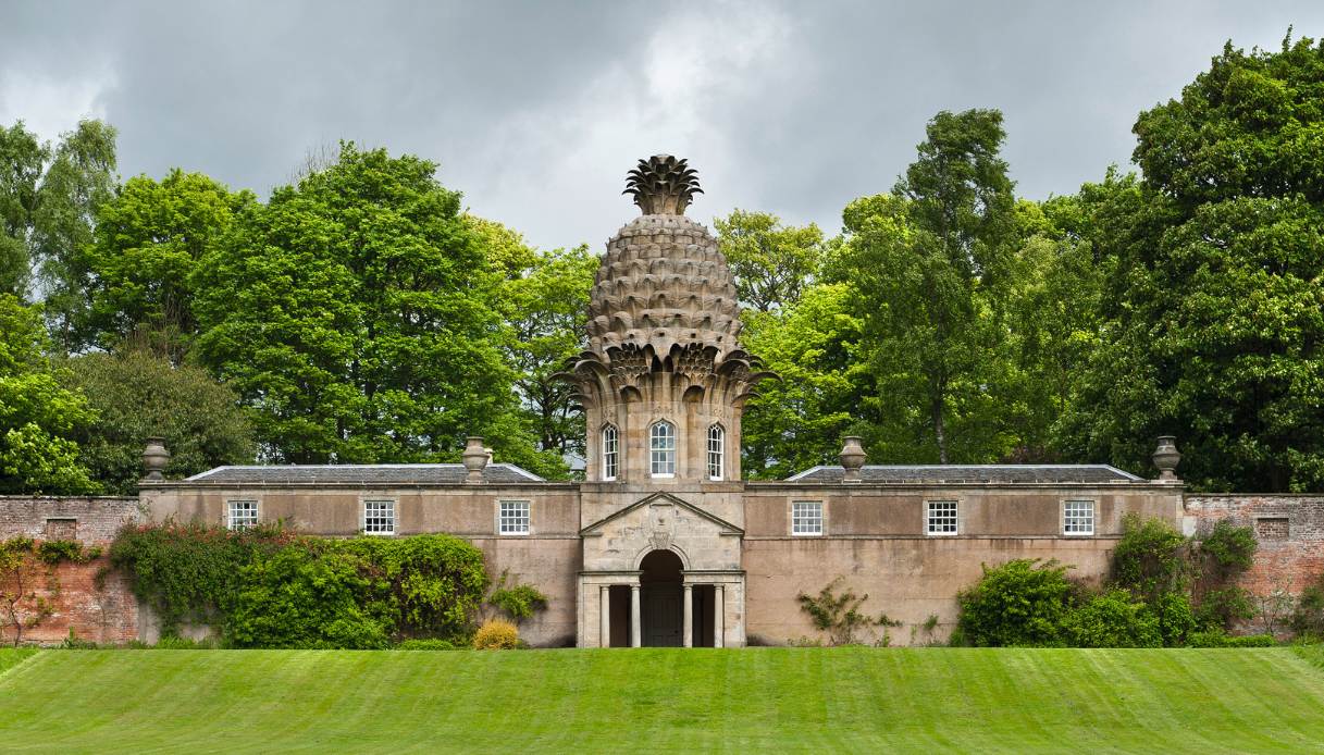Si presenta con una base neoclassica ordinata che regge una cupola che replica con precisione ossessiva il frutto tropicale. Possiede foglie rigide, scaglie incise e persino geometrie perfette. Il problema è che è completamente in pietra. Il visitatore che ci arriva avverte una sensazione di piacevole stranezza. Del resto, è tutto fuori posto rispetto al clima e al paesaggio circostante, caratterizzato da vento e pioggia. Eppure è un ananas gigante a dominare un bel giardino murato di questo grigio Paese del Regno Unito.