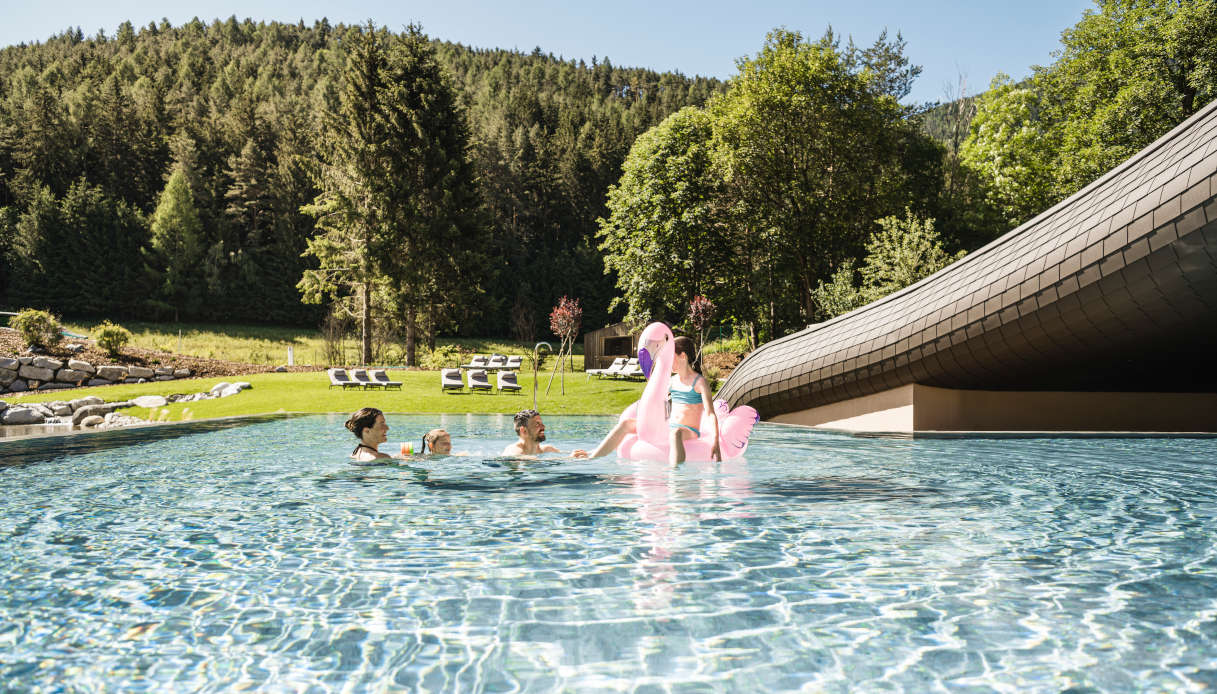 L’area acquatica del resort è uno dei punti di forza. Potete scegliere tra rilassarvi sulla riva del lago naturale privato con la sua spiaggia di sabbia fine, oppure sfidare i vostri figli (e voi stessi!) sullo scivolo ad acqua coperto più lungo dell’Alto Adige, completo di cronometro per rendere ogni discesa una gara emozionante.