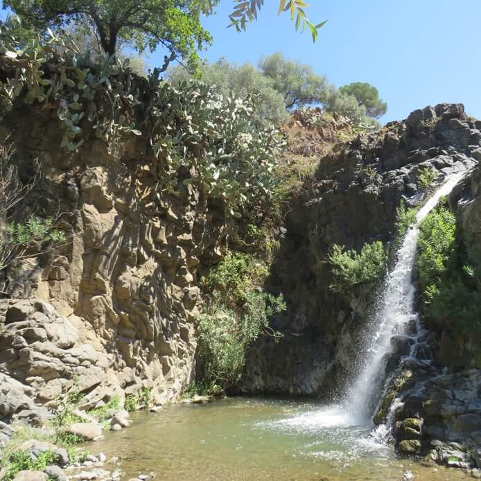 La cascata principale delle Cascate dell’Oxena è incastonata in un contesto naturale tipico di questa porzione del territorio siciliano. Tutt’attorno al salto, infatti, si può ammirare la peculiare conformazione rocciosa delle rocce basaltiche: quella pietra nera che affiora e assume le classiche forme simili alle canne di un organo è la testimonianza dell’antichissima attività vulcanica della zona.